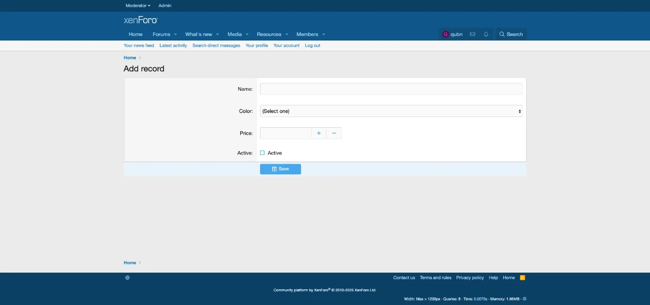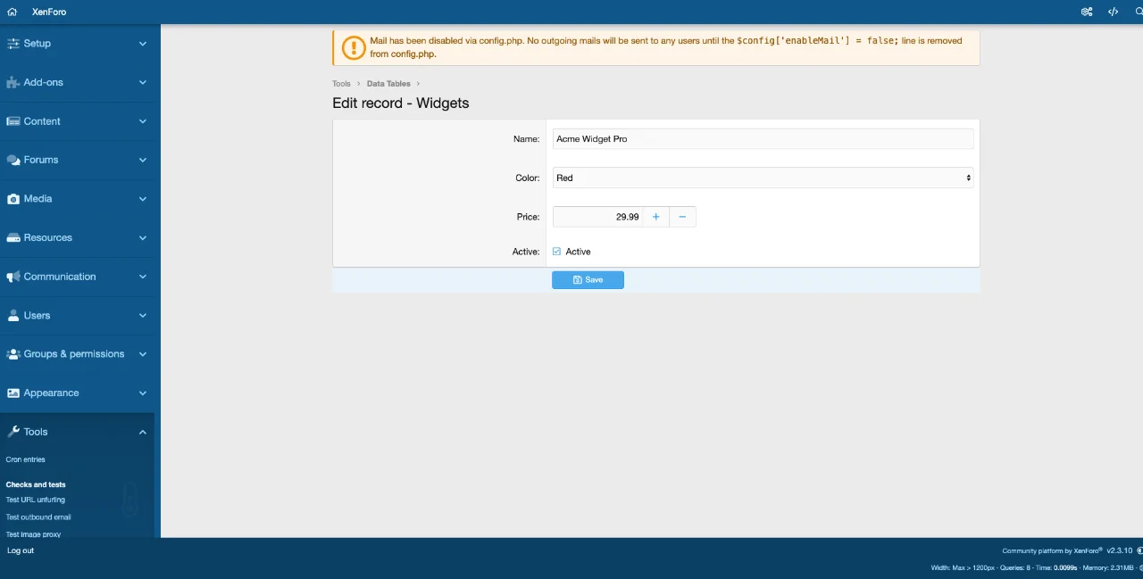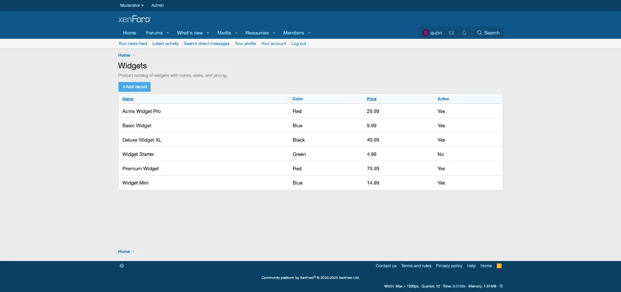 - Admin Record Management - Full CRUD for records within the AdminCP. Dynamic forms automatically adapt to your field definitions - text fields become text inputs, lookups become dropdowns, numbers get spinners, booleans get checkboxes, colors get pickers, rich text gets the BBCode editor.